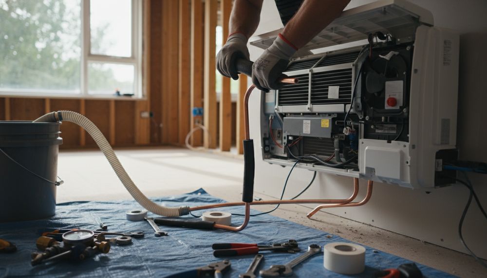 Підключення фреонової магістралі вимагає особливої точності та професійних навичок. Майстри обрізають мідні трубки до потрібної довжини спеціальним труборізом. Якість зрізу критично важлива для герметичності з’єднання.