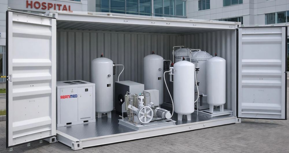 Контейнерне виконання для великих установок дозволяє розмістити обладнання поза будівлею лікарні. 20- або 40-футовий контейнер містить всі компоненти, готові до підключення.